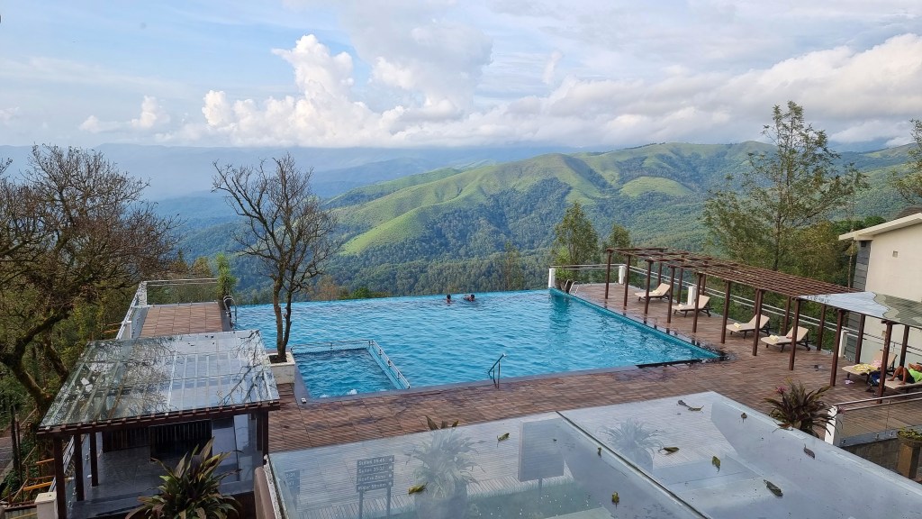 The infinity pool had majestic views of the valley.We could not use the pool as it was cold.Down below they got a coffee point from where one can witness Mullayanagiri and Bababudangiri peaks.After exploring the property we crashed into our luxury rooms to spend the night.Evenings and early mornings are very cold and those fog covered valleys during monsoon looked amazing and breathtaking.Fog covered silver oak trees gave a magical touch to the valley.